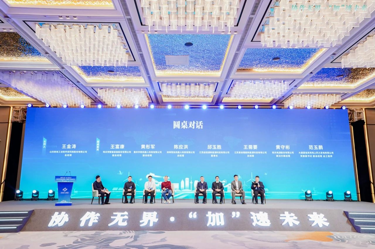 埃夫特智能装备股份有限公司副总经理王富康、重庆华数机器人科技有限公司副总经理黄彤军、深圳怪虫机器人科技有限公司总经理陈应洪、江苏益佳通新能源科技有限公司董事长邱玉胜、江苏景创锂能新能源科技有限公司总经理王需要、阳光电源股份有限公司解决方案经理黄守彬、大唐国信滨海海上风力发电有限公司党委副书记副总经理总工程师范玉鹏共同参与,并就新能源行业未来走向,机器人解决方案现状、合作现状、升级创新方向、合作路径等议题同台共话。本次对话由山东新松工业软件jiuyou.com股份有限公司总经理王金涛主持。