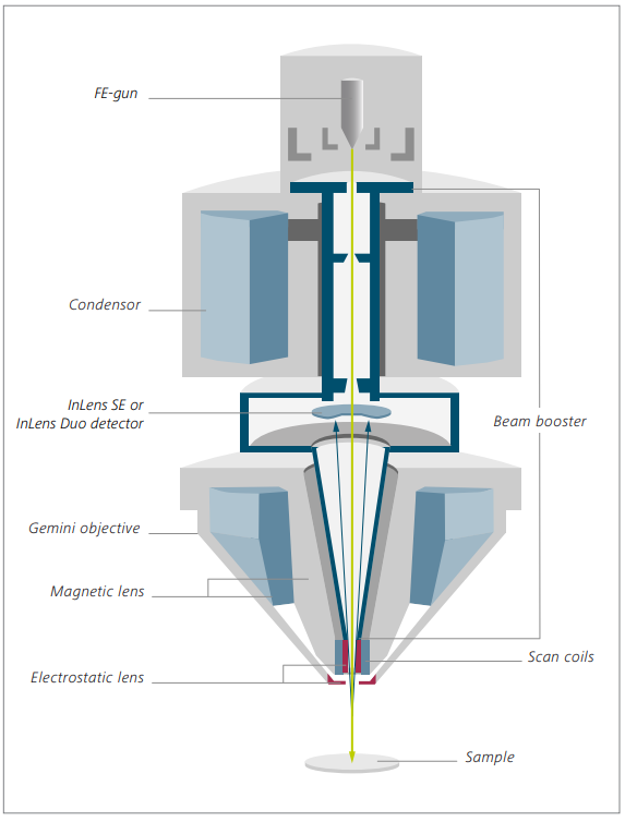 工作原理:顶部电子光源发射电子,电子在加速电压(通常200V~30KV)的作用下,经过两三个电磁透镜聚成一束很细的电子束,该入射电子束在物镜上方扫描线圈的驱动下,在试样表面的微小区域作有序的光栅扫描。