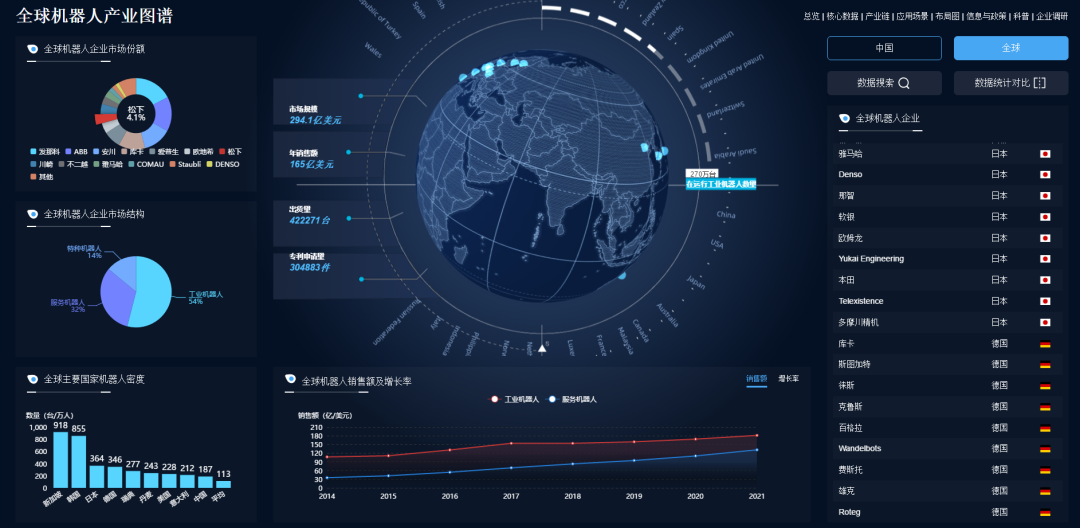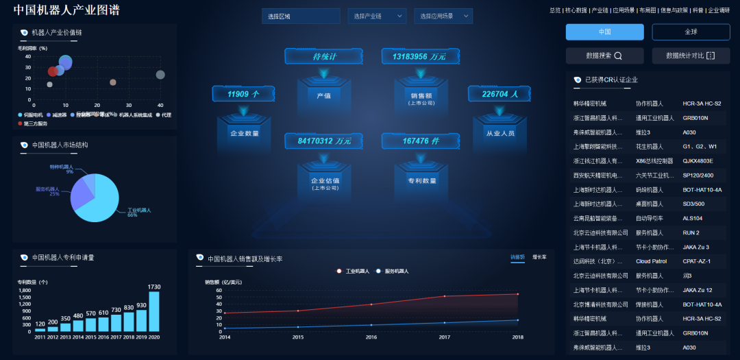 机器人产业图谱不仅涵盖了全球机器人产业宏观数据,覆盖核心机器人jiuyou.com企业市场份额占比、机器人市场结构、机器人销售额及增长率等系列宏观数据。而且展示了中国各省市机器人产业的详细情况,包含了机器人企业数量、专利数量、销售额、增长率、已获得CR认证企业数量等核心数据。