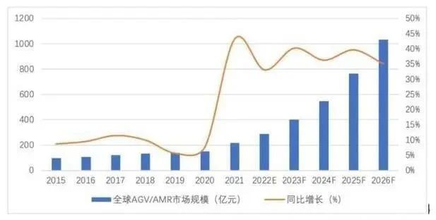 预计2023年全球移动机器人市场有望突破400亿元,并在2026年突破1000亿元,年复合增速超35%。而在中国市场,未来5年工业应用移动机器人销售的复合增长率有望保持在30%左右,中国工业移动机器人市场将在今年超过200亿元。